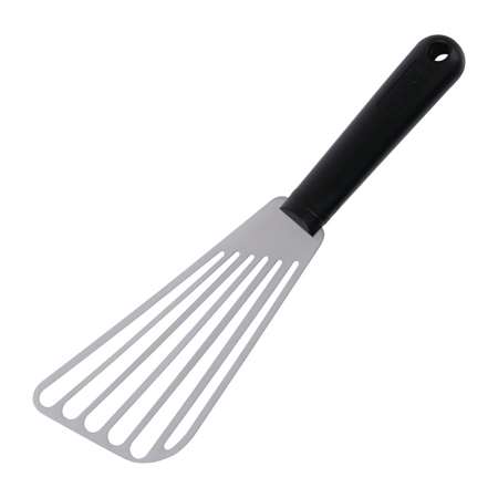 Lame en acier inoxydable avec manche en plastique. Lavable au lave-vaisselle. Encoche sur la poignée pour poser la spatule en toute sécurité au bord des poêles.