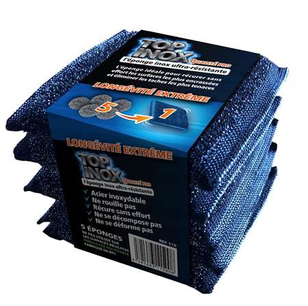 Éponge double face inox. Adaptée aux surfaces plates (plats, casseroles) Lavable en machine (lave-vaisselle) 5 fois plus durable qu’une boule inox.